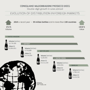 Let op, dit is DOCG Prosecco uit de best gelegen wijngaarden. In het onderstaande persbericht staat de export stijging in