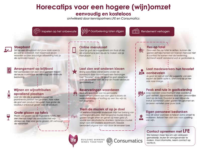 Om te onderzoeken hoe een ondernemer geholpen kan worden om een beter wijnrendement te realiseren, nam LFE het wetenschappelijk onderzoeksbureau Consumatics in de arm. Het onderzoek richtte zich op het beïnvloeden van gastgedrag in horeca op gebied van wijn. De uitgebreide literatuurstudie werd als test toegepast op een aantal locaties in de Nederlandse markt. En de resultaten liegen er niet om. Door neuromarketing in te zetten, geeft de gast meer uit aan wijn tijdens zijn bezoek en wel aan die wijn die voor de horecaondernemer qua marge het meest interessant is. Daarnaast stijgt de totale omzet van het horecabezoek en zelfs de gastwaardering.