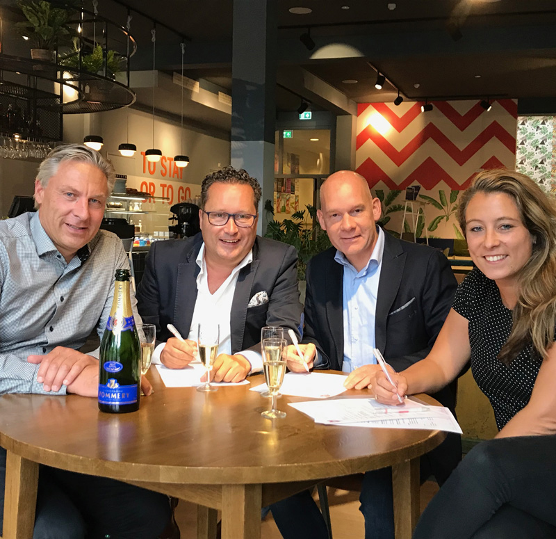 Foto van links naar rechts ; Erik Delmee ( LFE, Business Unit Manager Out of Home ), Joep de Man ( LFE, National Accountmanager Out of Home ), Peter de Beer ( Operations Manager Stayokay), Marissa Roggeveen ( Operations Manager Stayokay ).
